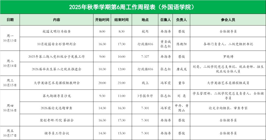 外国语学院2025年秋季学期第6周工作周程表