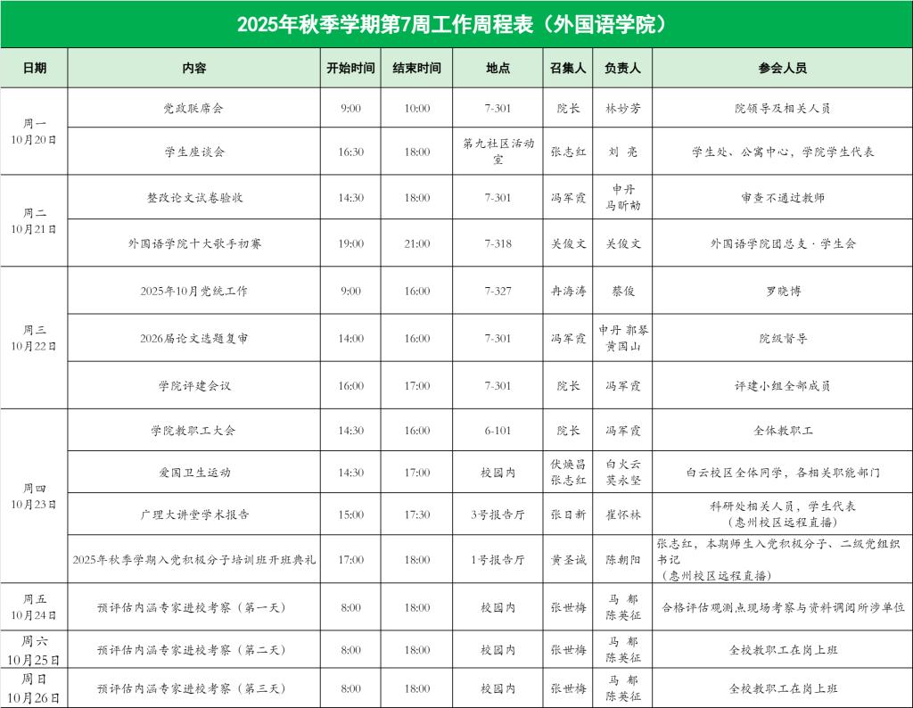 外国语学院2025年秋季学期第7周工作周程表