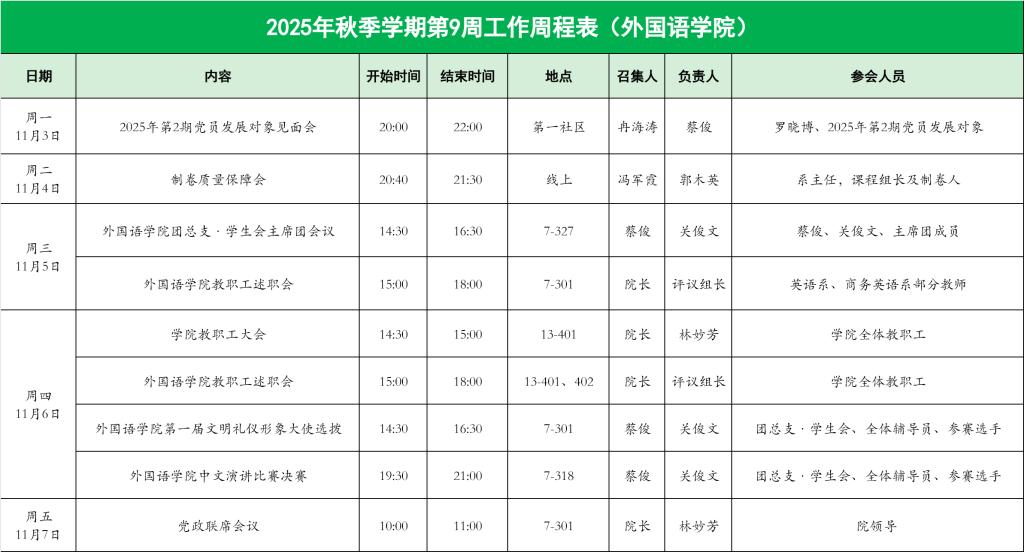外国语学院2025年秋季学期第9周工作周程表