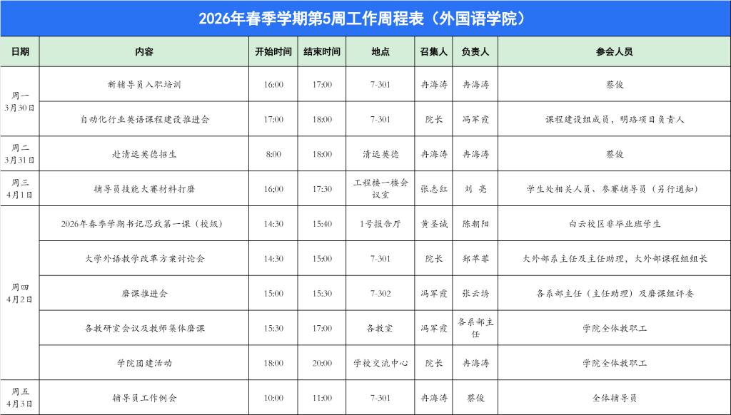 外国语学院2026年春季学期第5周工作周程表